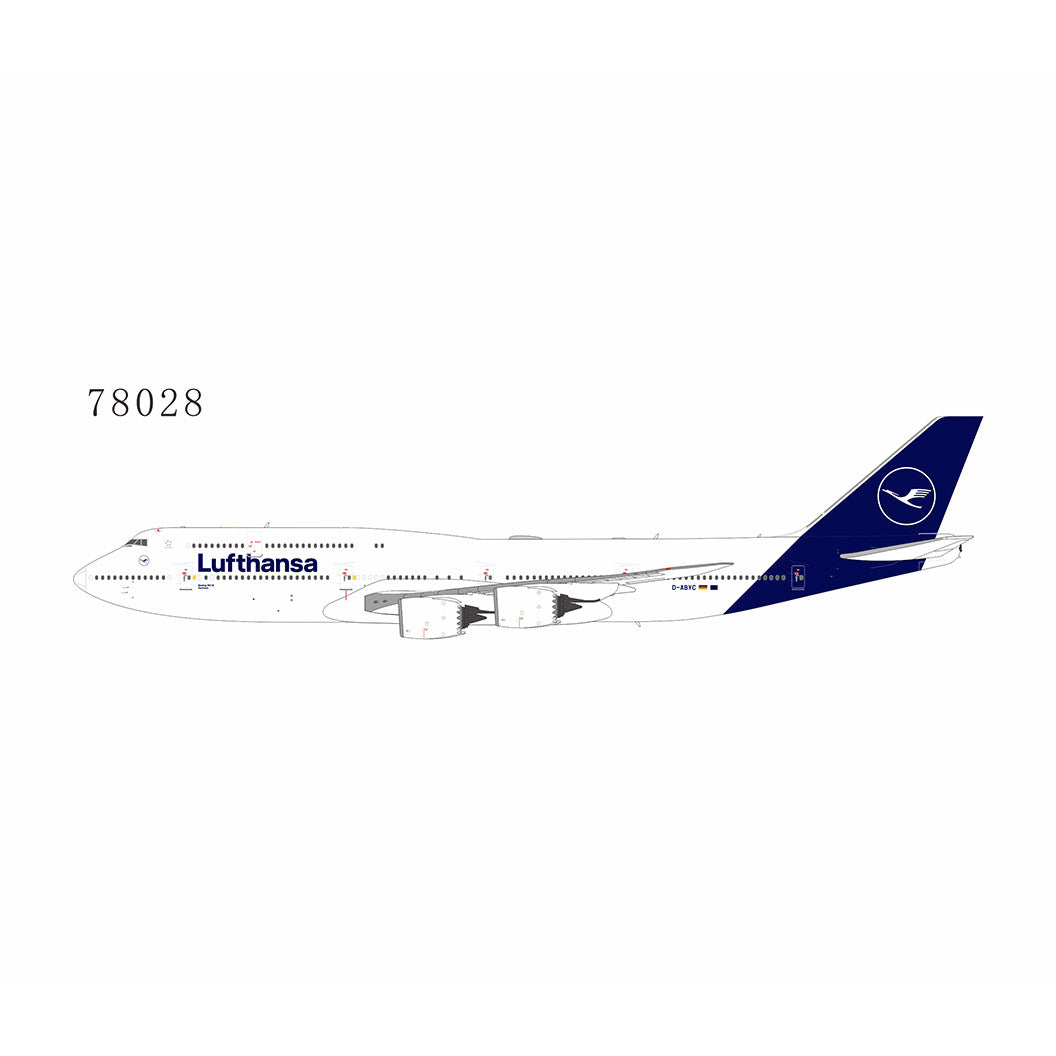 The NG Models Lufthansa Boeing 747-8 D-ABYC n/c 1/400 78028 is a 1:400 scale die-cast model aircraft. This highly detailed collectible features accurate livery and surface details, including antennas, registration markings, panel lines, and windows. The model is pre-assembled and ready for display, with fixed landing gears and a metal construction.